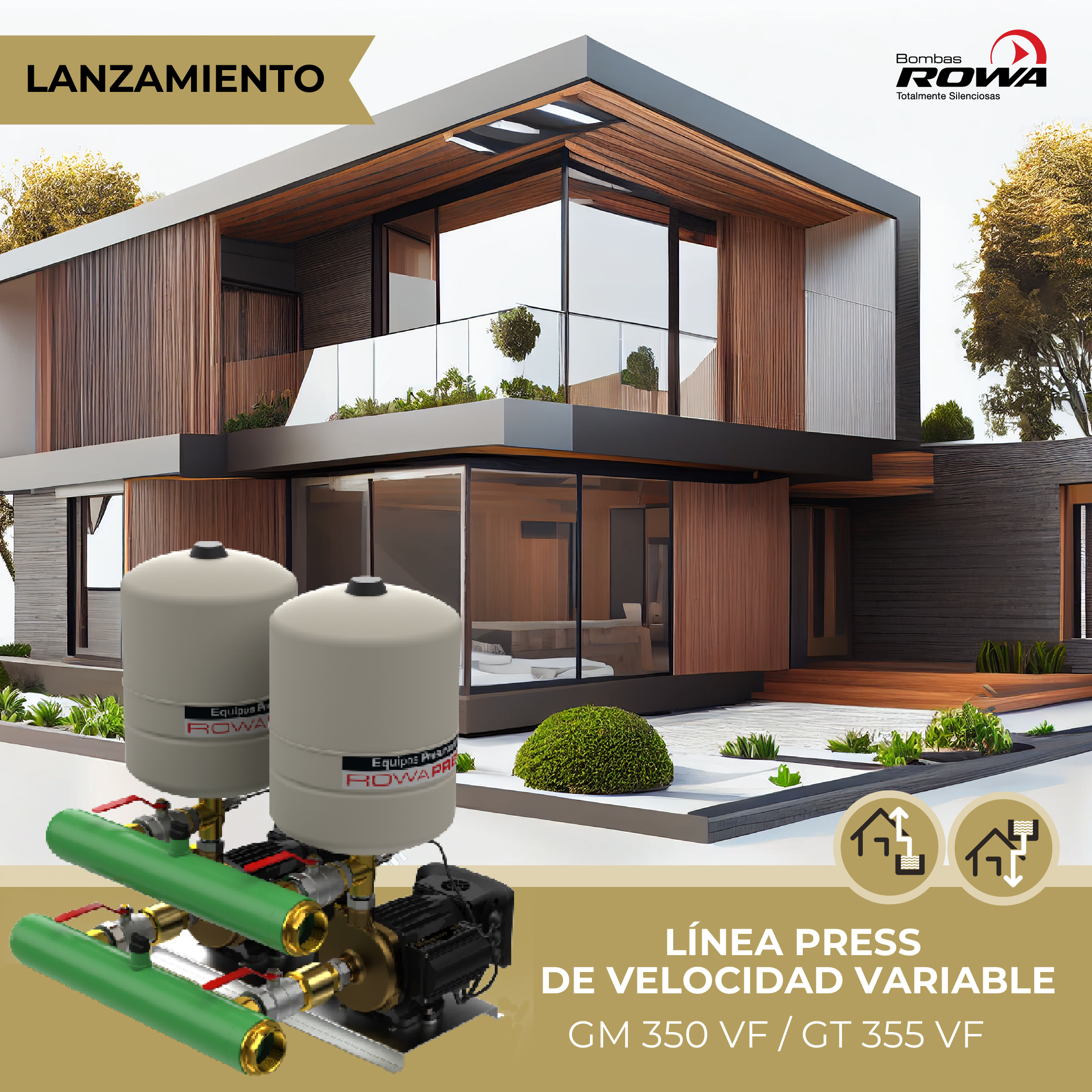 Los equipos ROWA PRESS modelos GM 350VF y GT 355VF son Grupos de Presión  con variador de frecuencia, compuestos por dos equipos presurizadores (MAX PRESS 35VF + MAX PRESS 35VF) que trabajan en alternancia y con arranques en cascada. El variador de frecuencia permite ajustar la velocidad de modo de proveer la misma presión en todo momento, independientemente del caudal de agua.