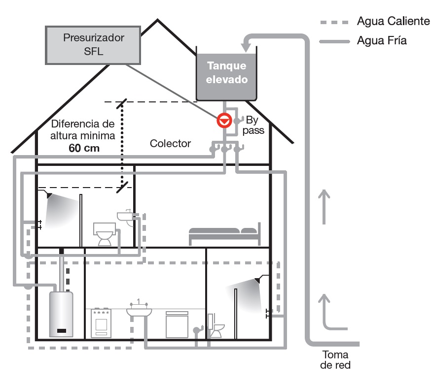 Aumento de presión de agua en residencias en general, nuevas o antiguas con tanque elevado. Apto para viviendas con tuberías de 20 años o más. Hasta 6 duchas